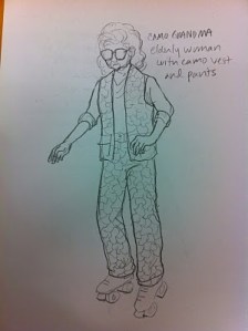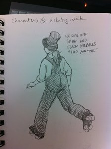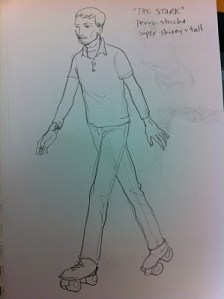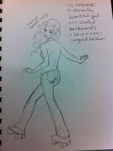 For real. I haven’t been to the Fountain Valley Skating Center since like 7th grade. But you know what, it hasn’t changed a whole lot. A friend of mine just wanted to go roller skating with a bunch of people while she was in town, and since this was the closest place to us we decided to go for it. My skating on 4 wheels hasn’t gotten any better since 1984, but I sure noticed a lot more interesting characters. They made such an impression on me that I had to commit them to paper. It was like a John Waters movie set at a roller rink.