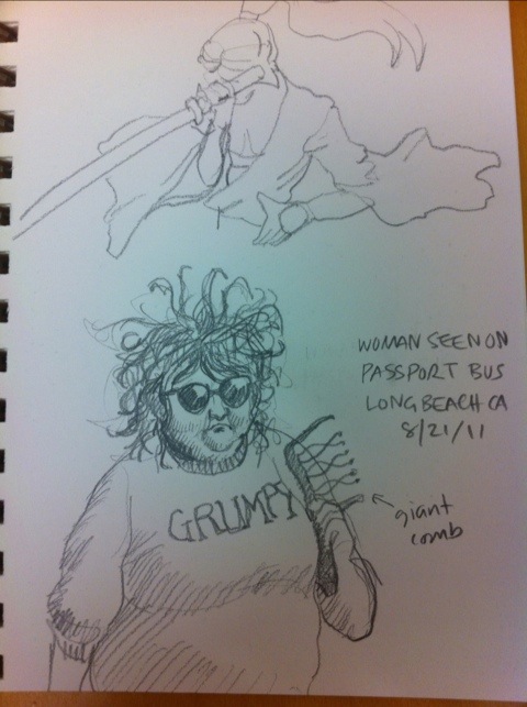 I saw a lady on the local bus yesterday who made quite an impression on me. She had this crazy huge teased hair (a la Robert Smith of The Cure) that was thinning on the back, was wearing a sweatshirt that said “Grumpy,” and to top it all off, was carrying a GIANT comb.
