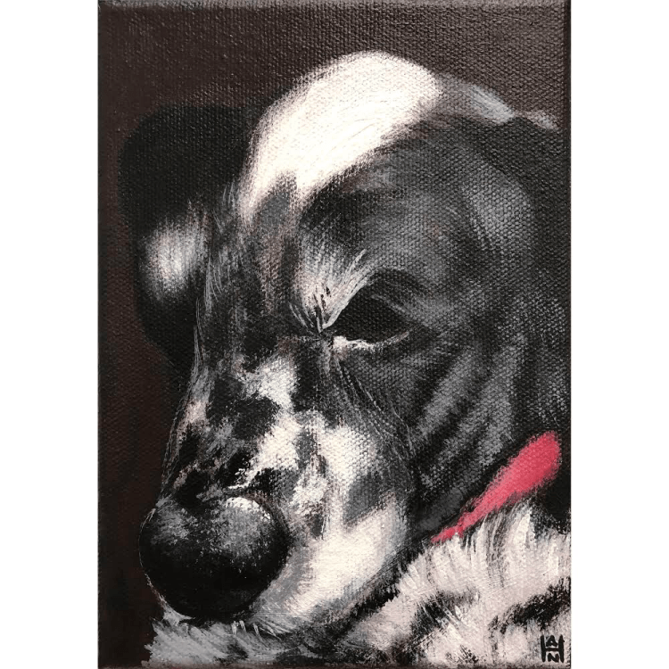 “Spyder”, 5″ x 7″, acrylic on canvas. A portrait commissioned by some dear friends ❤️ #longbeachartist #madeinlongbeach #petportrait #dogpotrait #animalart #dogart #petart