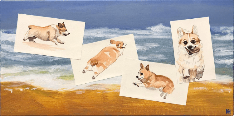 “Corgi Beach Day”, 12” x 24”, mixed media. Created for the Corgi Beach Day shows happening at MADE by Millworks starting this Saturday evening! I’ll also have greeting cards of the corgi images available for sale there also. 🐶❤️ #corgibeachday #longbeachart #longbeachartist #madeinlongbeach #dogart #corgiart #petportrait #petportraitartist