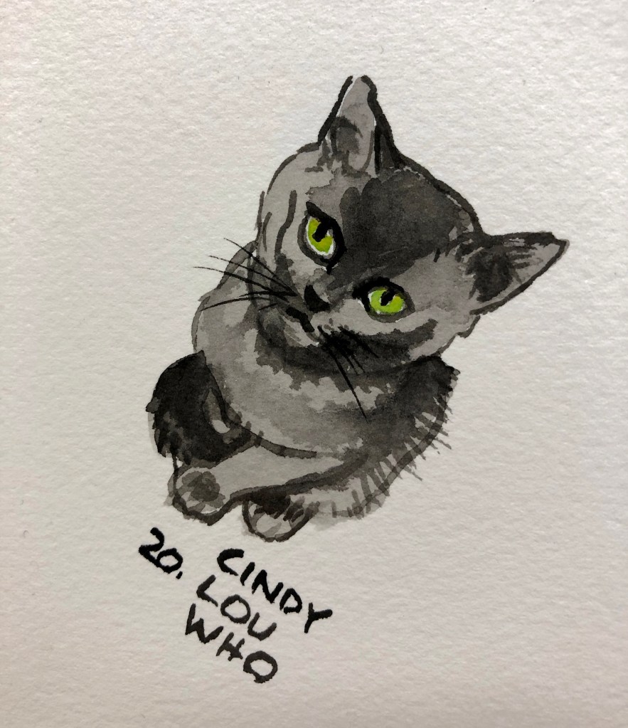 Day 20 “31 Felines”: Cindy Lou Who, an adorable little gray kitten! Hopefully by the end of 31 days things will be meowch better. #fdala #catart #longbeachart #graycat #longbeachartist #adoptdontshop