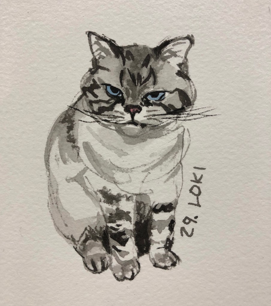 Day 29, “31 Felines”: Loki! Don’t let her fearsome countenance fool you, she’s as sweet as they come—see for yourself at @loki_kitteh Hopefully by the end of 31 days things will be meowch better. #fdala #catart #longbeachart #longbeachartist #adoptdontshop