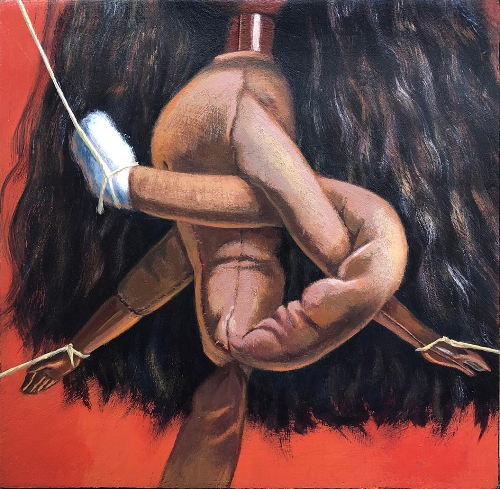 From my Alter Egos series from the turn of the last century: “Tied Up”, 6×6, acrylic on wood panel. #acrylicpainting #creepydolls #longbeachartist #dollpainting
