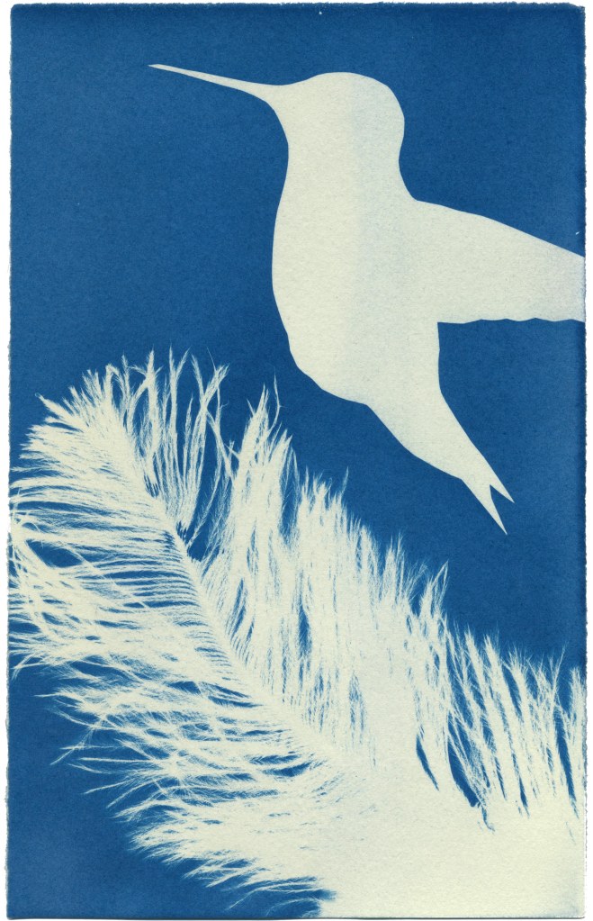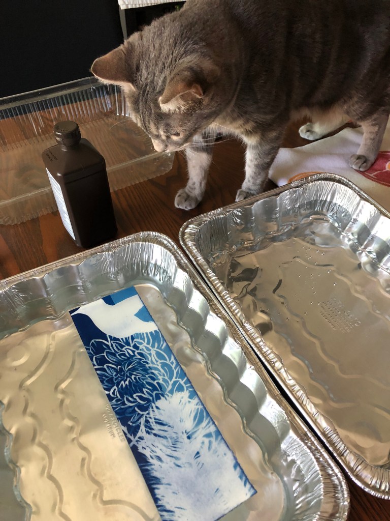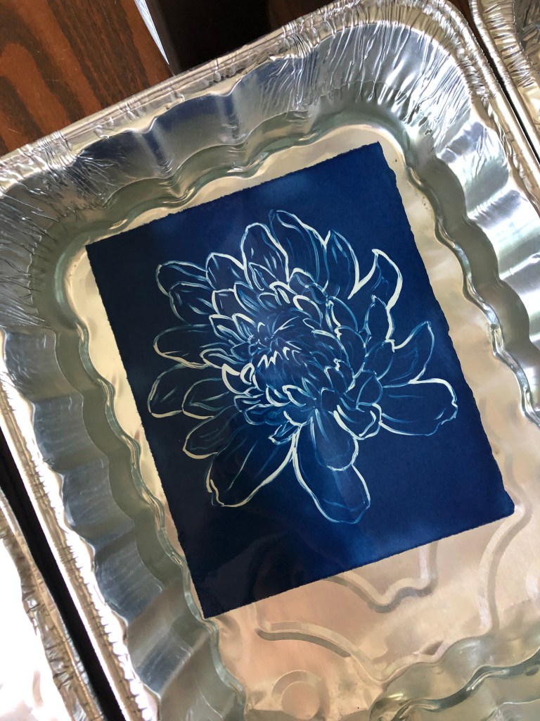I took a Zoom cyanotype workshop through Flux Art Space recently—taught by fellow Long Beach artist May Roded—and it was a lot of fun! I’d always admired the beauty of cyanotypes but had never explored it until now, and discovered it to be a fairly simple and inexpensive process that can produce some really amazing results. It was a 2-part workshop, with a week in between. In the first session, May went over the history of cyanotypes and the process of preparing the chemicals to go on whatever substrate you want to use (watercolor paper is always a good option). In the week in between, I collected materials and created some custom images to use for the cyanotypes (paintings on Dura-Lar, stencils). For the second session I picked up a packet that contained sheets of paper pre-treated with the chemicals and a glass panel, backing board, and binder clips for holding the materials together.