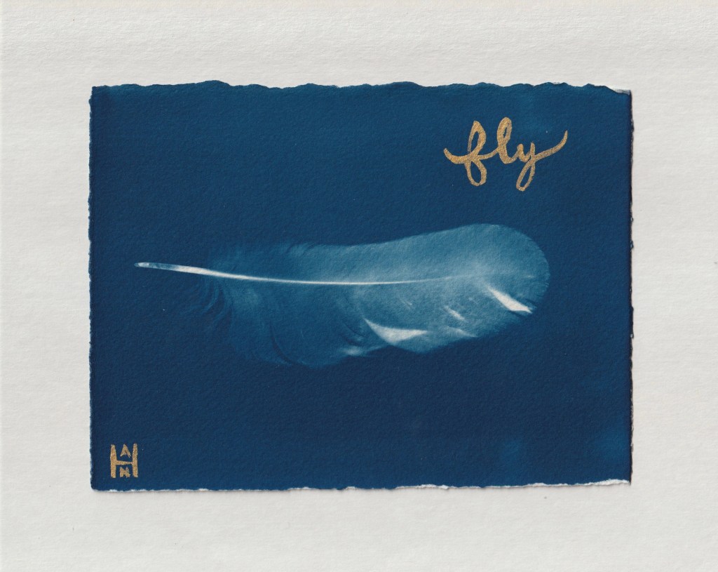 Feeling light as a feather “Fly”, cyanotype embellished with acrylic paint, 8×10 (backing board size), $50. SOLD #cyanotype #cyanotypeprint #feather