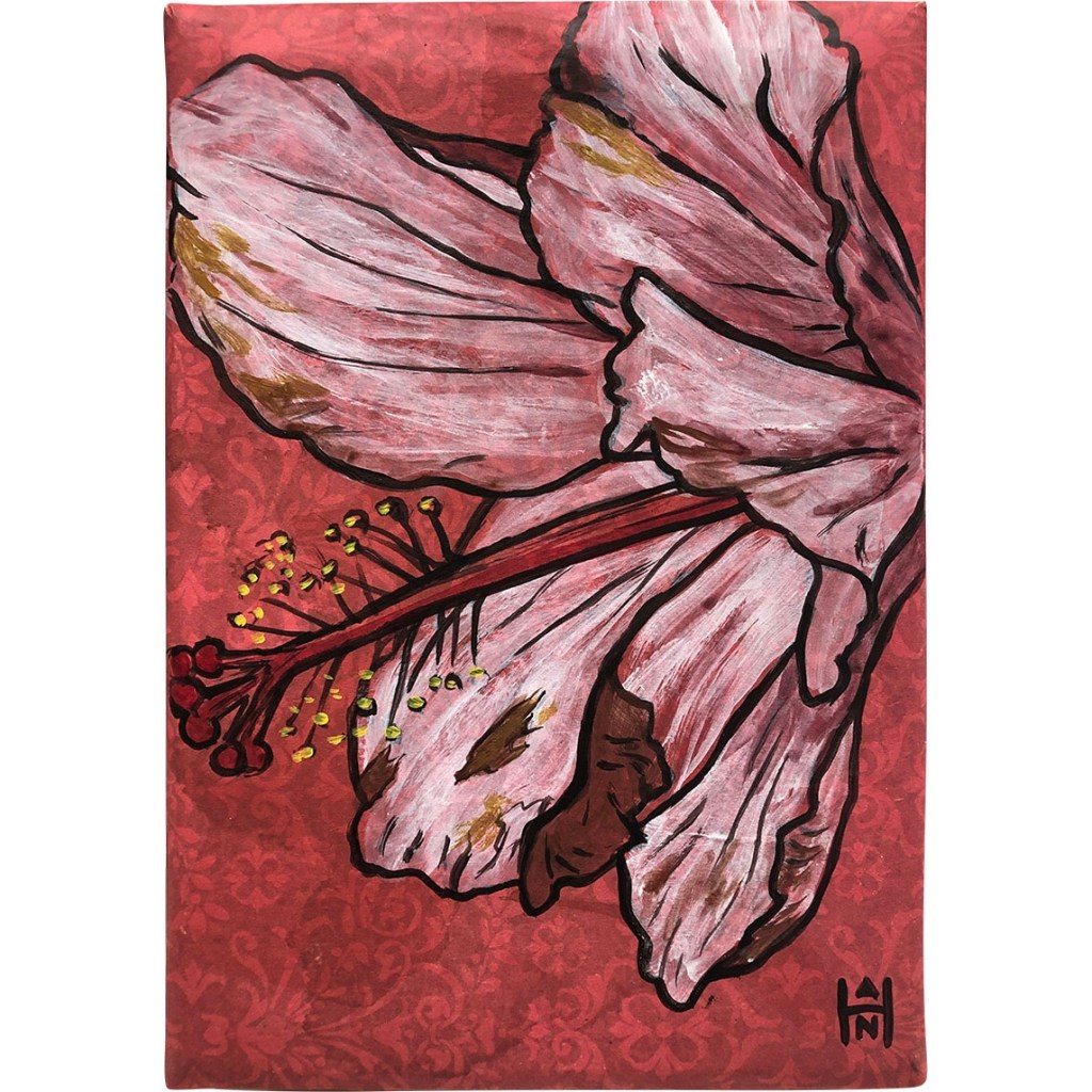 “Flores Tragico – Hibiscus”, 5×7, mixed media. An offshoot of my Graphic Flora series that means “tragic flowers” in Latin. This came about as I was exploring ideas for the “Melancholia” show. I was inspired by Victorian decay. #flowerart #hibiscus