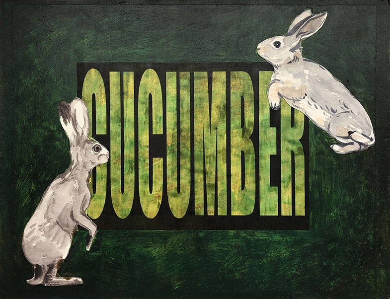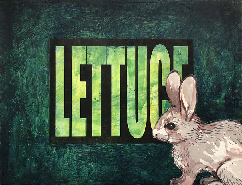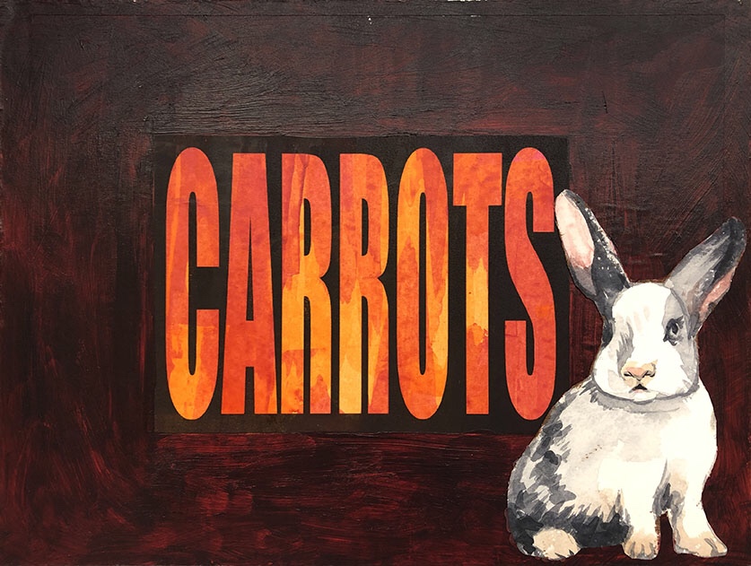 “Word Salad/Rabbit Food”, mixed media on Masonite, 9×12. A collaboration series with fellow Long Beach artist Dave Clark that we completed over the summer. Dave came up with the words and the initial colors, which I then embellished with additional acrylic paint and watercolor rabbits on paper. #longbeachartists #kongbeachart