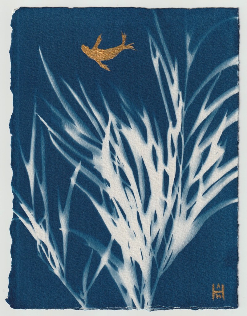 “Golden Sea Lion”, cyanotype embellished with acrylic paint, 5.5”x7.25” (in 10x12frame) Now at the Small Works Show at Page Against the Machine bookstore – $75. #cyanotype #cyanotypeprint #sealion