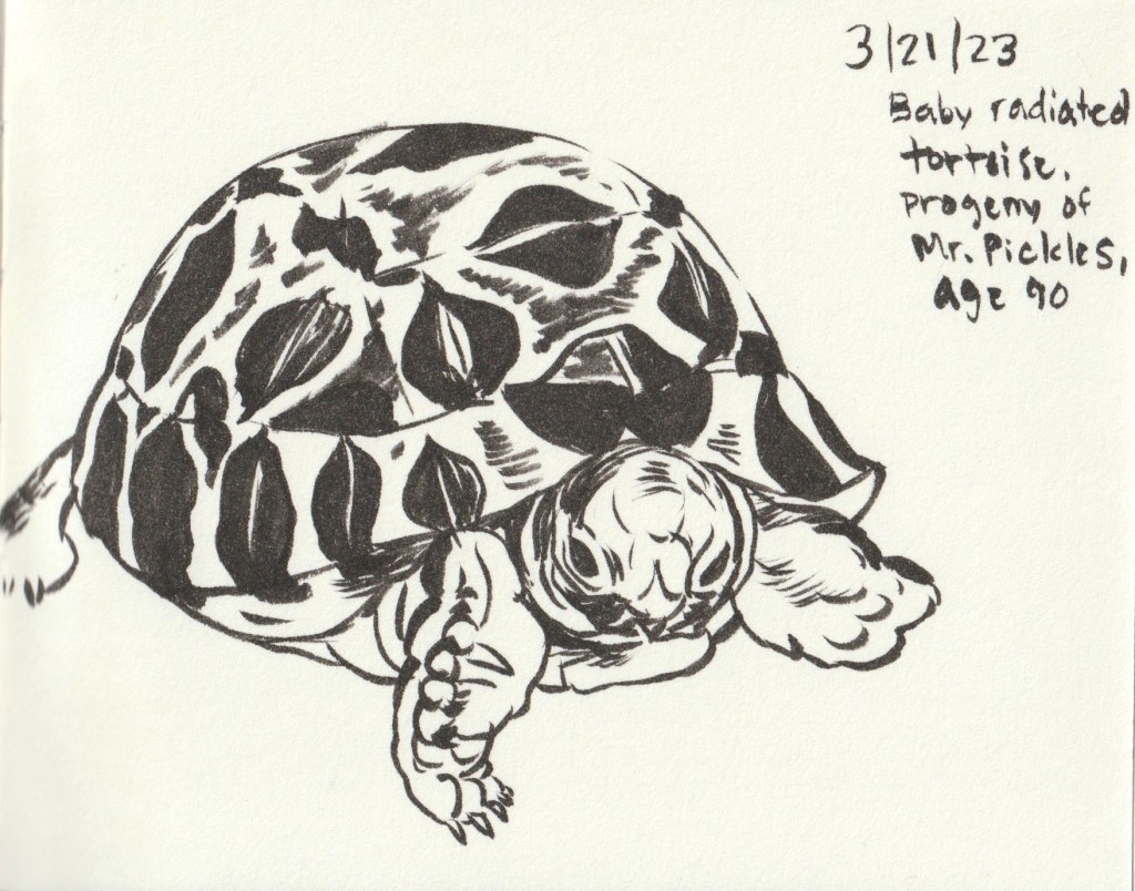 Brush pen drawing of a baby radiated tortoise, one of three born to 90 year-old Mr. Pickles and his much younger companion, the 53 year-old Mrs. Pickles! π₯ππ’ #radiatedtortoises #mrpickles #brushpendrawing