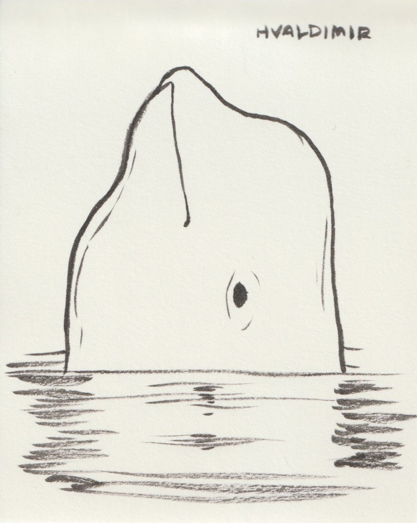 A quick brush pen drawing of #hvaldimir , the Russian spy beluga whale who was spotted in Norway in 2019 and had been living there until recently. He was just spotted in Sweden, where he faces heightened danger from boats and people. According to the NPR article I read, “Belugas are highly social whales and he has been living all alone the past four years.” 😢 I hope the sanctuary they’re planning in Norway comes in time for this guy, who deserves better from humans. #hvaldimirthewhale