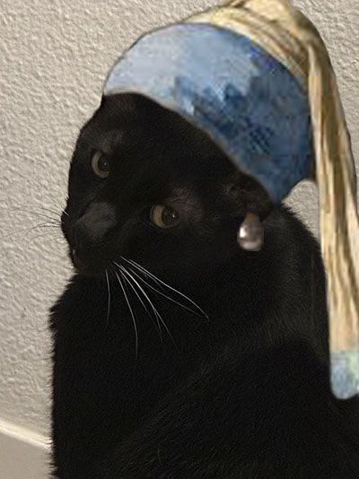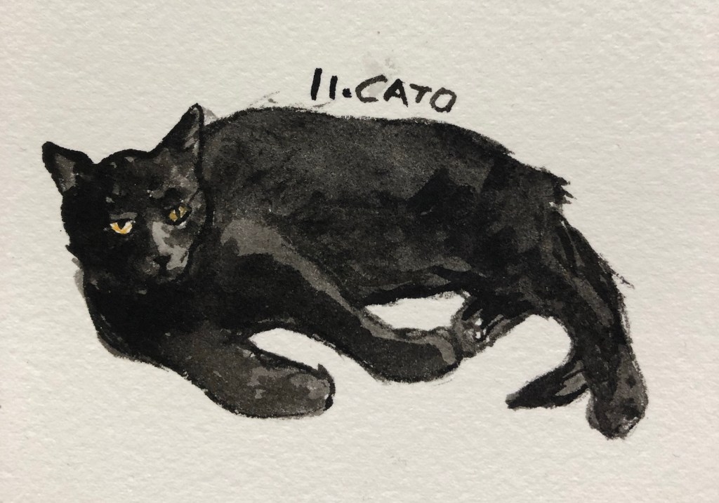 He was Norman’s cat when we met; Norman didn’t know too much about his backstory, other than he’d been returned to Kitten Rescue because he bit a kid. He was of indeterminate age—they figured maybe around 6. He was also hanging out all by himself in the office away from the general population because he did not like other cats. Soon after Norman started fostering him it was discovered that he had stomatitis, an autoimmune condition where the body starts attacking the gums, causing painful inflammation. He eventually had to get all his teeth removed, and Norman despaired that a 6 year old black cat with a bad attitude and no teeth would ever get adopted, so he adopted him (sucker 😝) . His original name was Charlie, but Norman changed it to Cato (pronounced “Kay-to”) because he loved to hide and jump out at you like the chauffeur character in the Pink Panther movies. He was absolutely chill with people (except for that kid he bit) but was still a total jerk to other cats, so we had to work out a system to keep him separated from my cats, BB and CC. It was a challenge, but we made it work, because he was worth it.