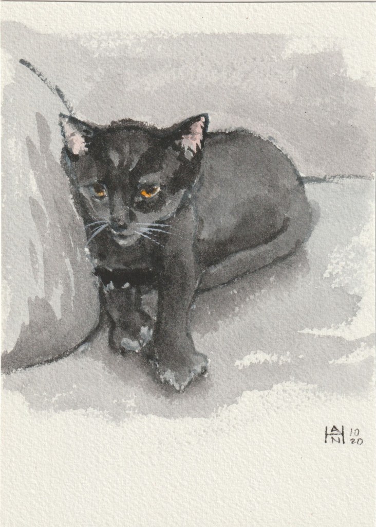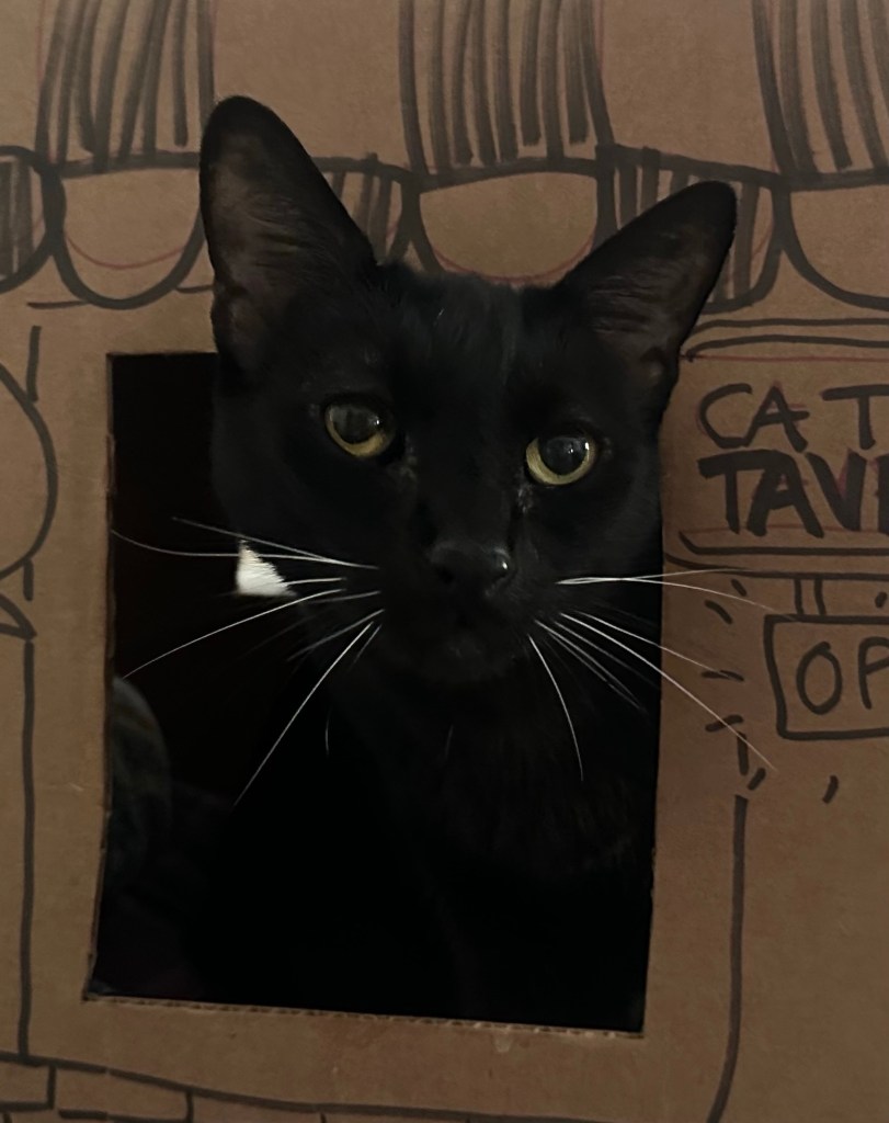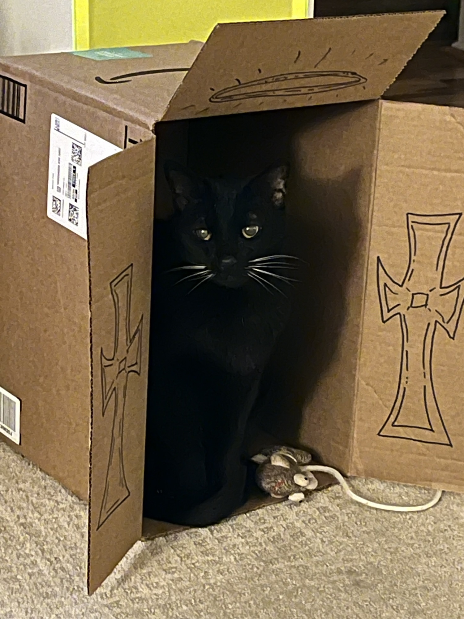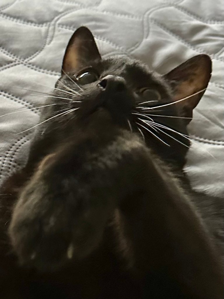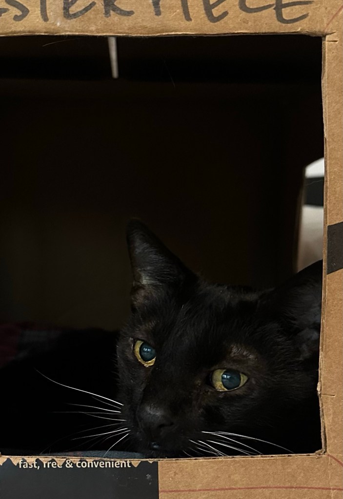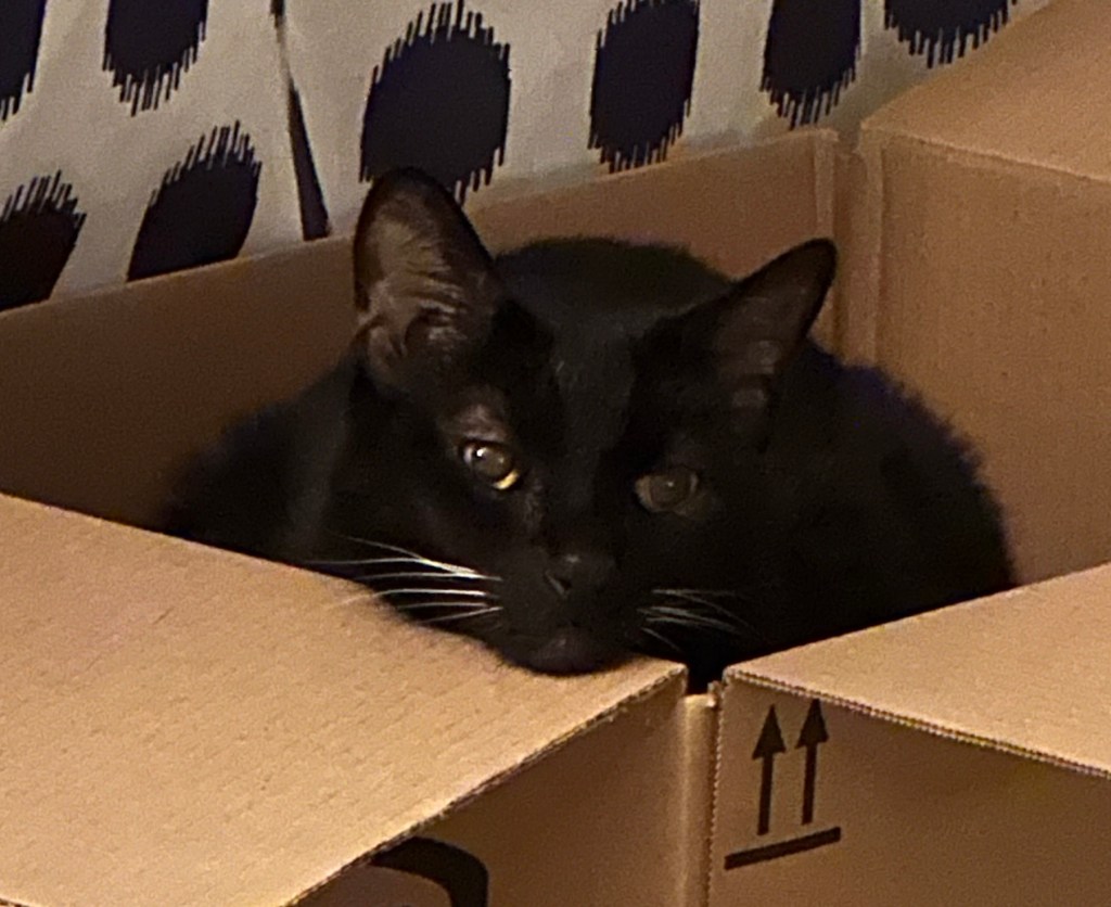 His distinctive feature: He started out with all black whiskers, but one by one they turned white until he had a magnificent set of white bow tie whiskers. Some of the stuff he loved: sleeping by Norman’s head; chilling out on the back of the couch while we were on it, occasionally rubbing his face into our hair; he loved his heated mat, especially when we put the cardboard box with windows cut out (“Cato’s Tavern”) over it; his homemade fish toy, which he’d drag out when we were gone. So many great memories with our little boy; we miss him dearly. RIP, Cato, hope you’re living your best afterlife somewhere. 🖤