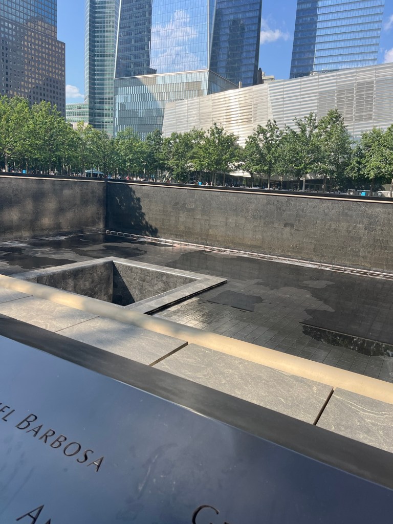 After ducking into Chelsea Market for a quick snack and look-see, we ambled around Lower Manhattan. We stopped by the 9/11 Memorial, which unfortunately didn’t have its water feature running at the time. Still impressive, though.