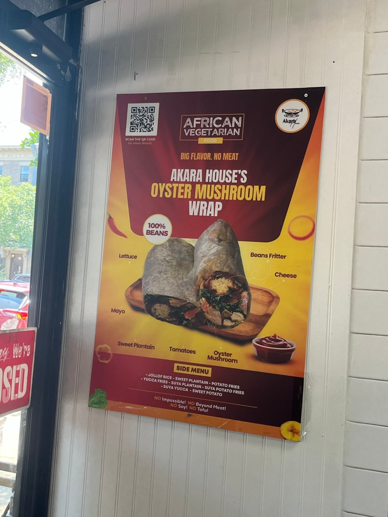 We had to save stomach space for one of the restaurants I’d bookmarked in Brooklyn, a vegan Nigerian fast food joint called Akara House. I’d read about them in the New Yorker and was intrigued. We took a bus to a decidedly unglamorous part of Brooklyn, but we found the food to be very tasty and worth the trip.