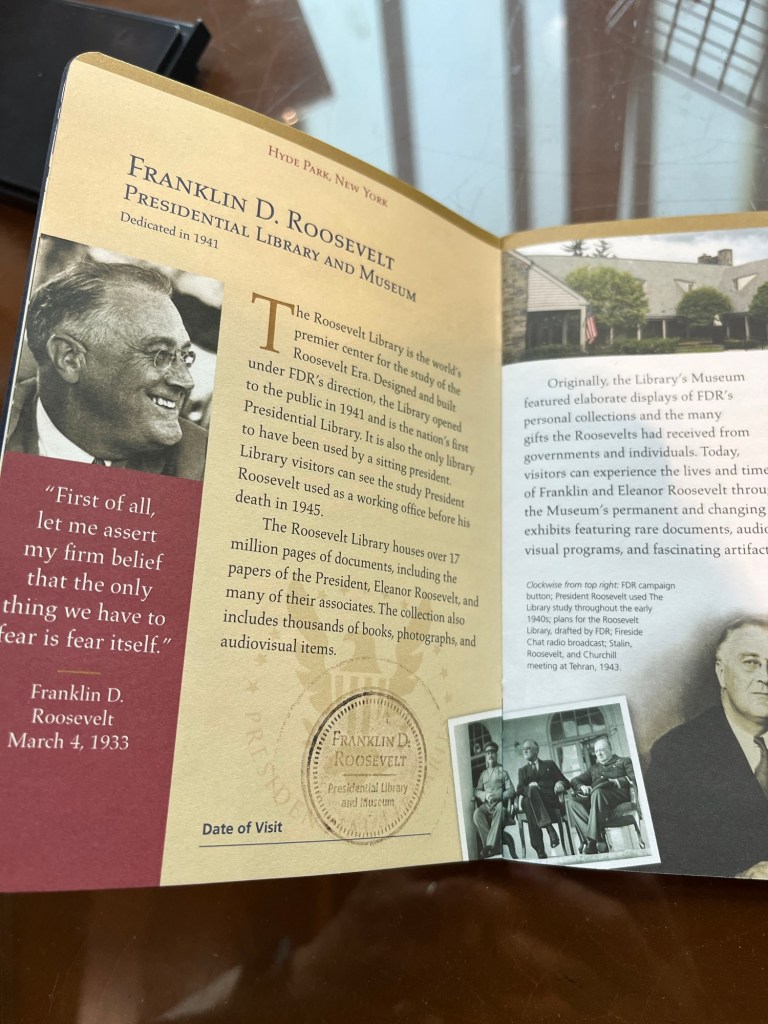 Ever since we visited the Carter Center in Atlanta back in 2019 and got Presidential Library passports from the gift shop, we’ve been on a mission to visit them all and get our stamps (yes, we are super nerds.) Hence our stop in Hyde Park to visit the FDR Presidential Library. We’ve been to 5 others so far: Jimmy Carter, LBJ, George W Bush, Ronald Reagan, and Richard Nixon. Had to hold my nose for the last three 🤢.