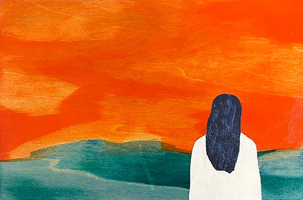 “Standing on a Beach”, mixed media, 4×6. Simple and contemplative. Playing with translucency and opacity of the paint on wood grain.