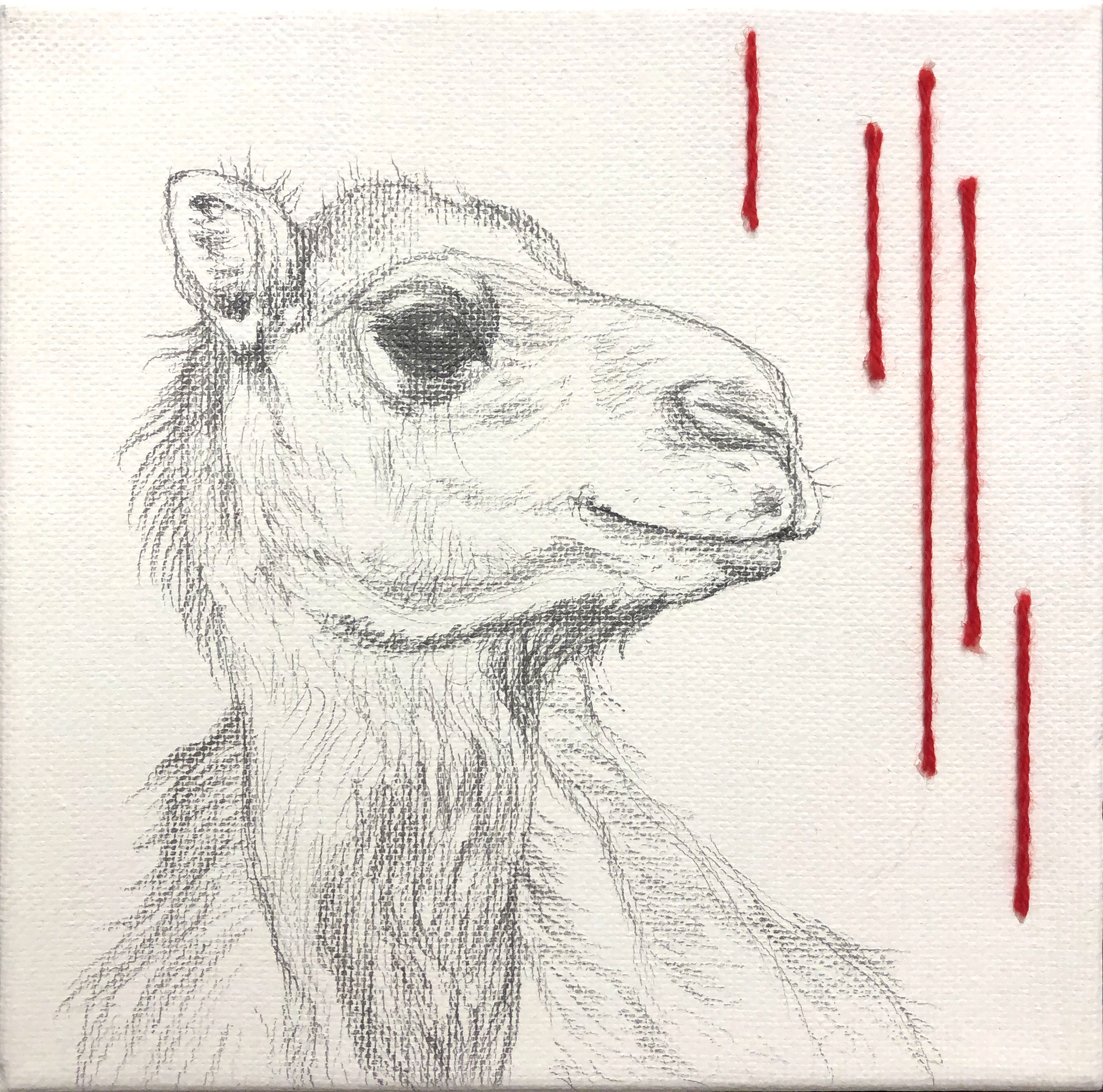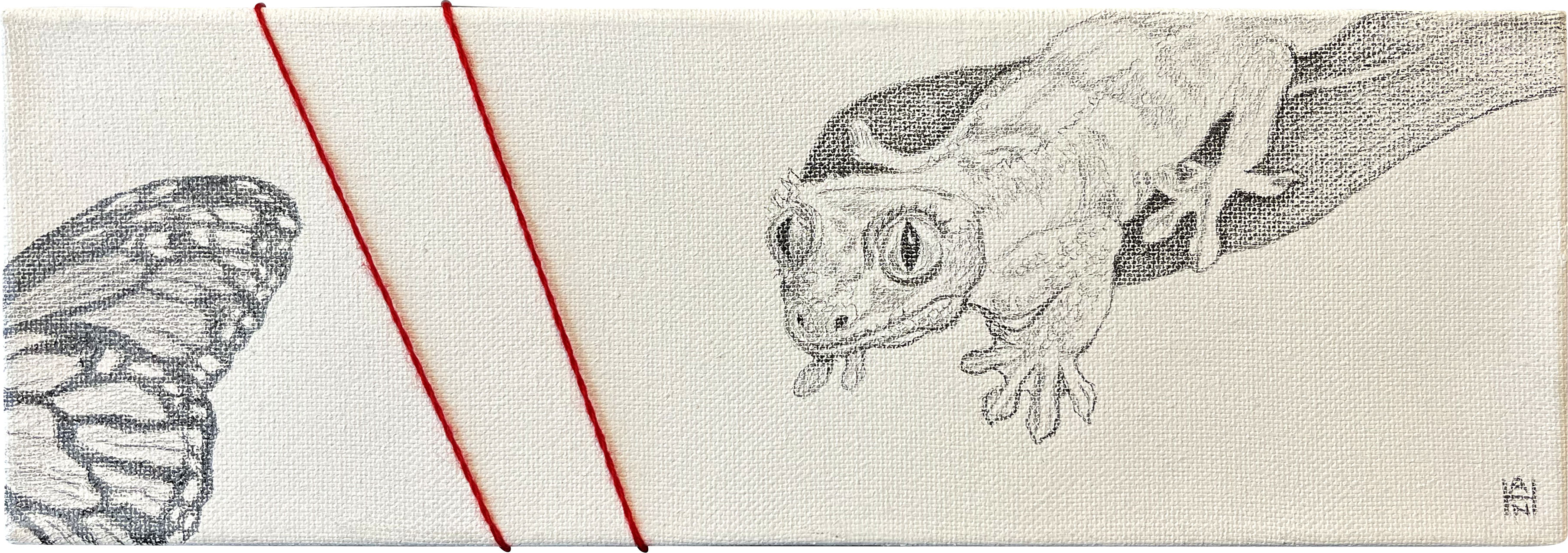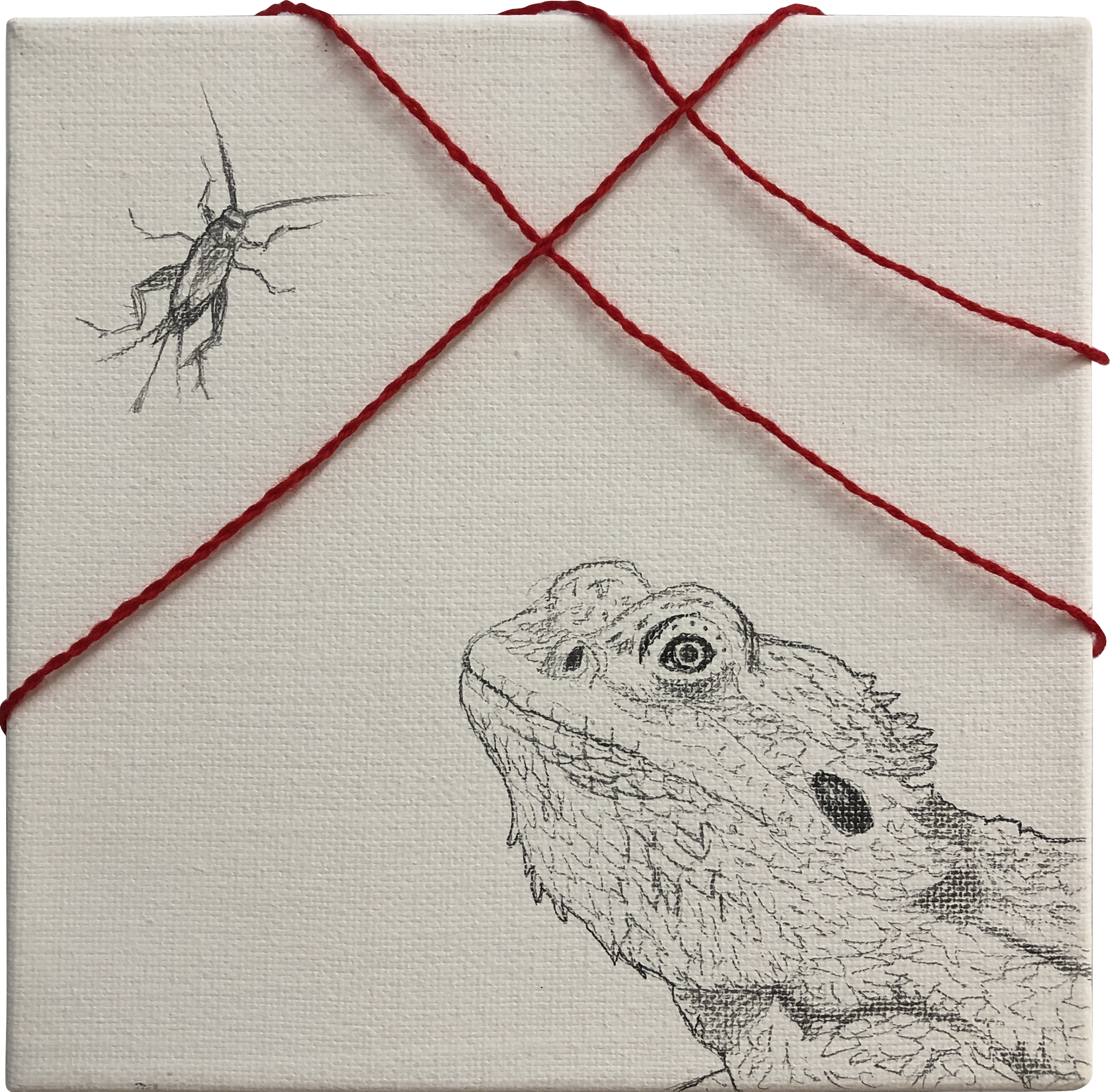 “Blood Lines Main Panel”, Graphite and yarn on canvas, 36×48“Camel”, Graphite and yarn on canvas,6×6“Bearded Dragon and Cricket”, Graphite and yarn on canvas, 6×6“Gecko and Monarch”, Graphite and yarn on canvas, 4×12