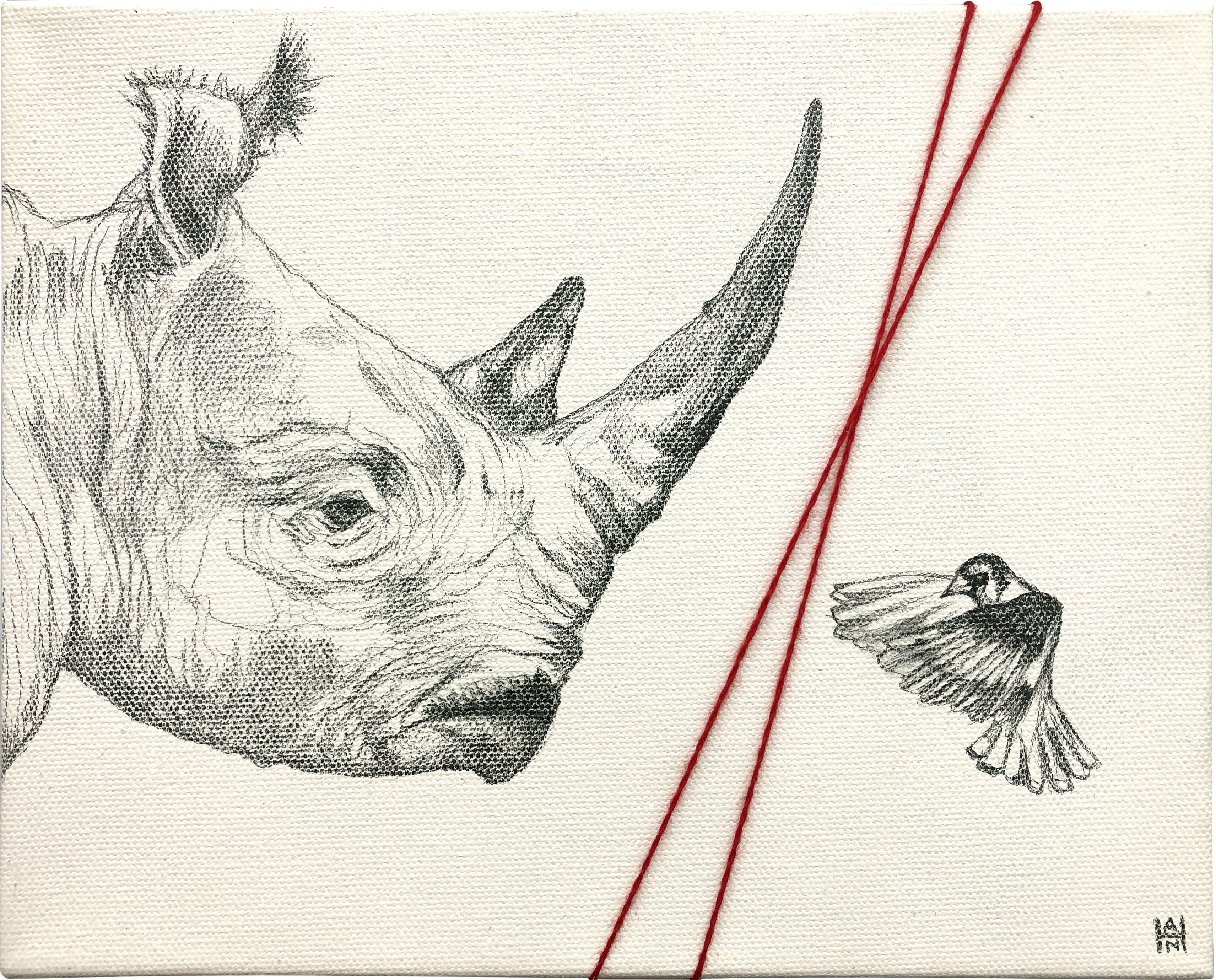 “Wolf and Hare”, Graphite and yarn on canvas, 15×30