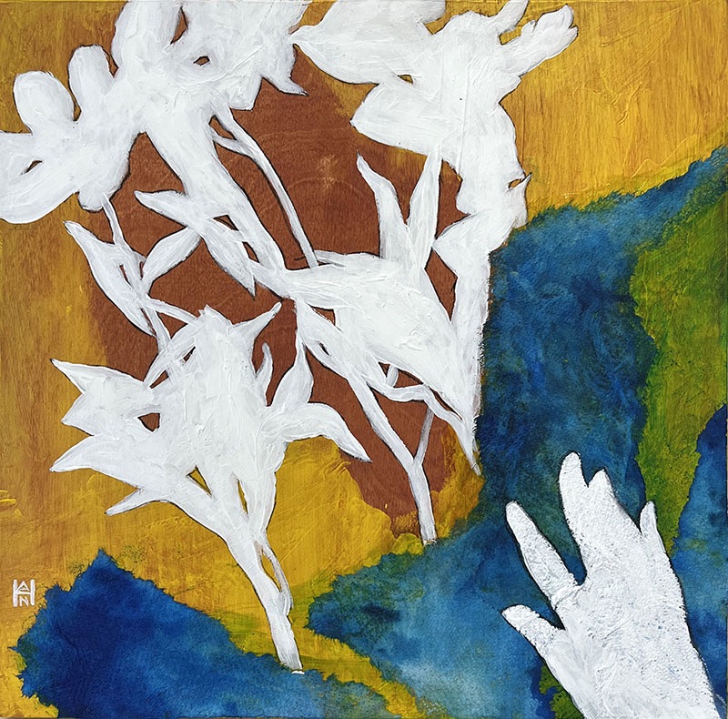 “Narcissus”, Mixed media, 10×10. Finished up this piece I started in the mixed media class that I taught @artsupplywarehouse back in August! Turns out all it needed was a hand in the corner, but had to sit with it a while to figure that out. 😅 Love how the colors came together in this one!