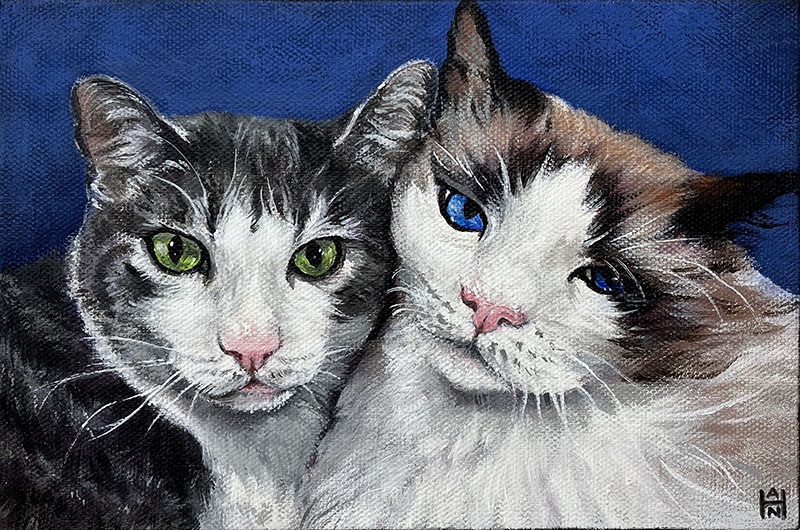 “Benny and Manny“, 6”x9”, acrylic on canvas. A commissioned piece for @bennythecatsjustice These two brothers are so beautiful and love each other so much! They really warm my heart; it was an absolute pleasure to paint them! ❤️❤️