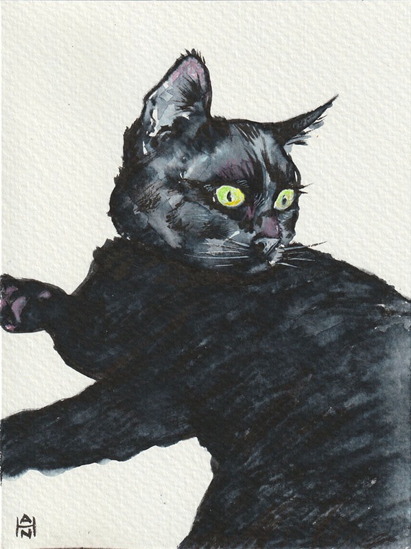 “Fudge”, 8×6, Pen, wash, and color pencil on watercolor paper. Worked on this bad boy last night @tacobelldrawingclub to submit to the “Locals Only” cat rescue benefit show @coolcatcollectivelbc. https://coolcatcollective.co/ Deadline is 11/16 midnight!