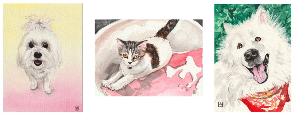 These are the standard sizes/mediums/prices that I offer, but I can also do custom work outside of these, if desired. All prices include tax; shipping & handling are extra.